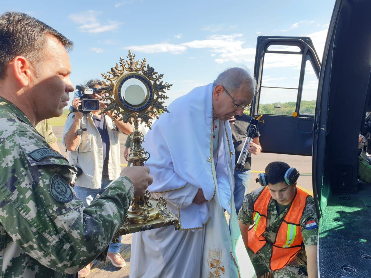 Portando el custodio, que guarda el Santísimo Sacramento, que para los creyentes es Cristo consagrado en la hostia, el arzobispo metropolitano realizó el vuelo para implorar el cese de la pandemia, que pone en vilo a la humanidad.